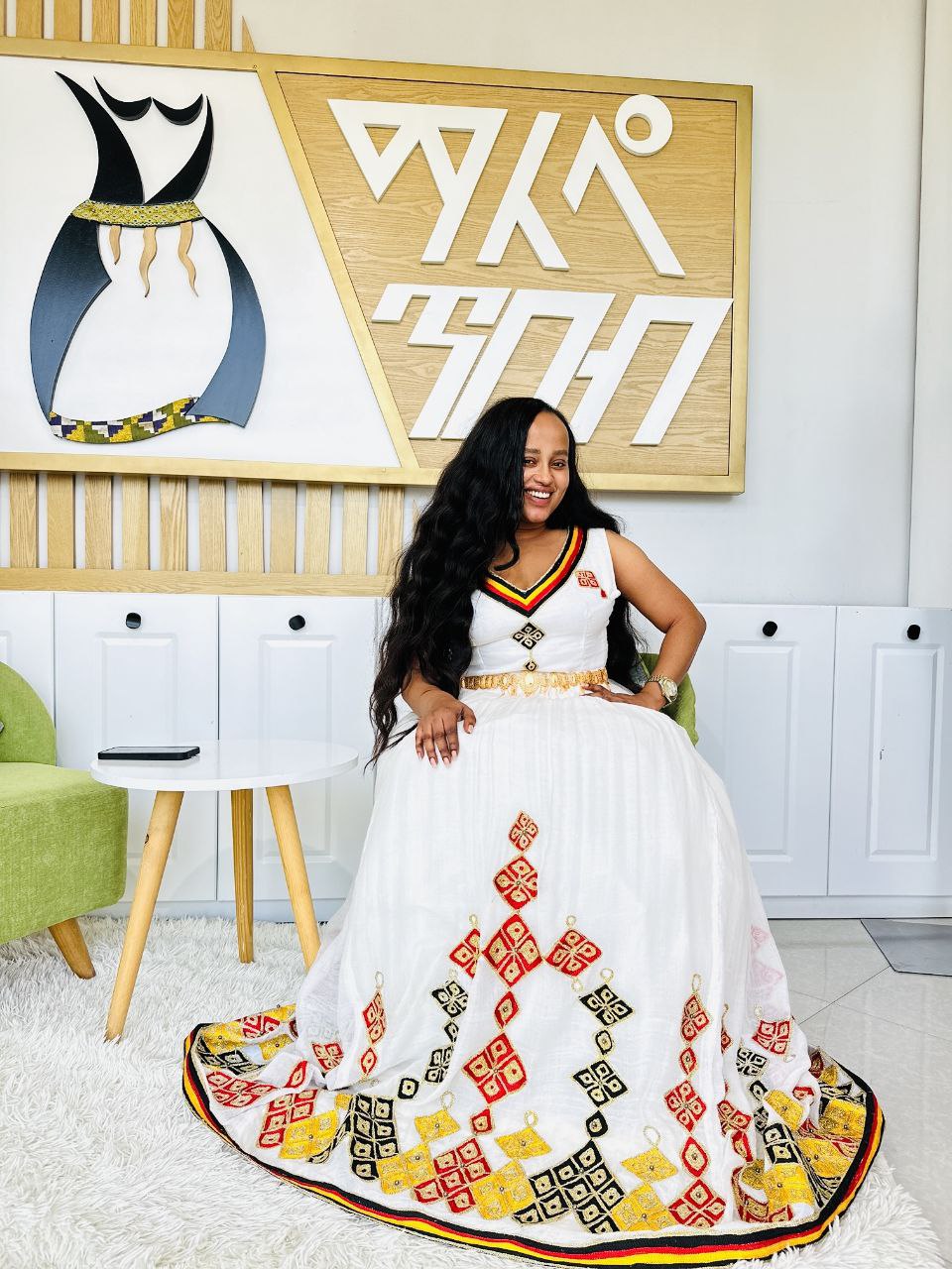 with a cinched waist and flowing skirt.